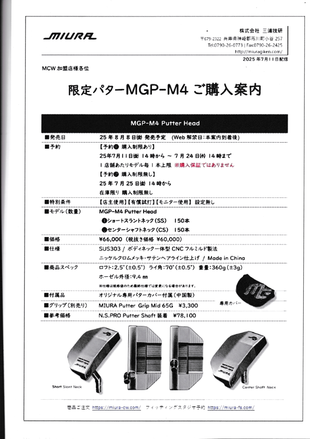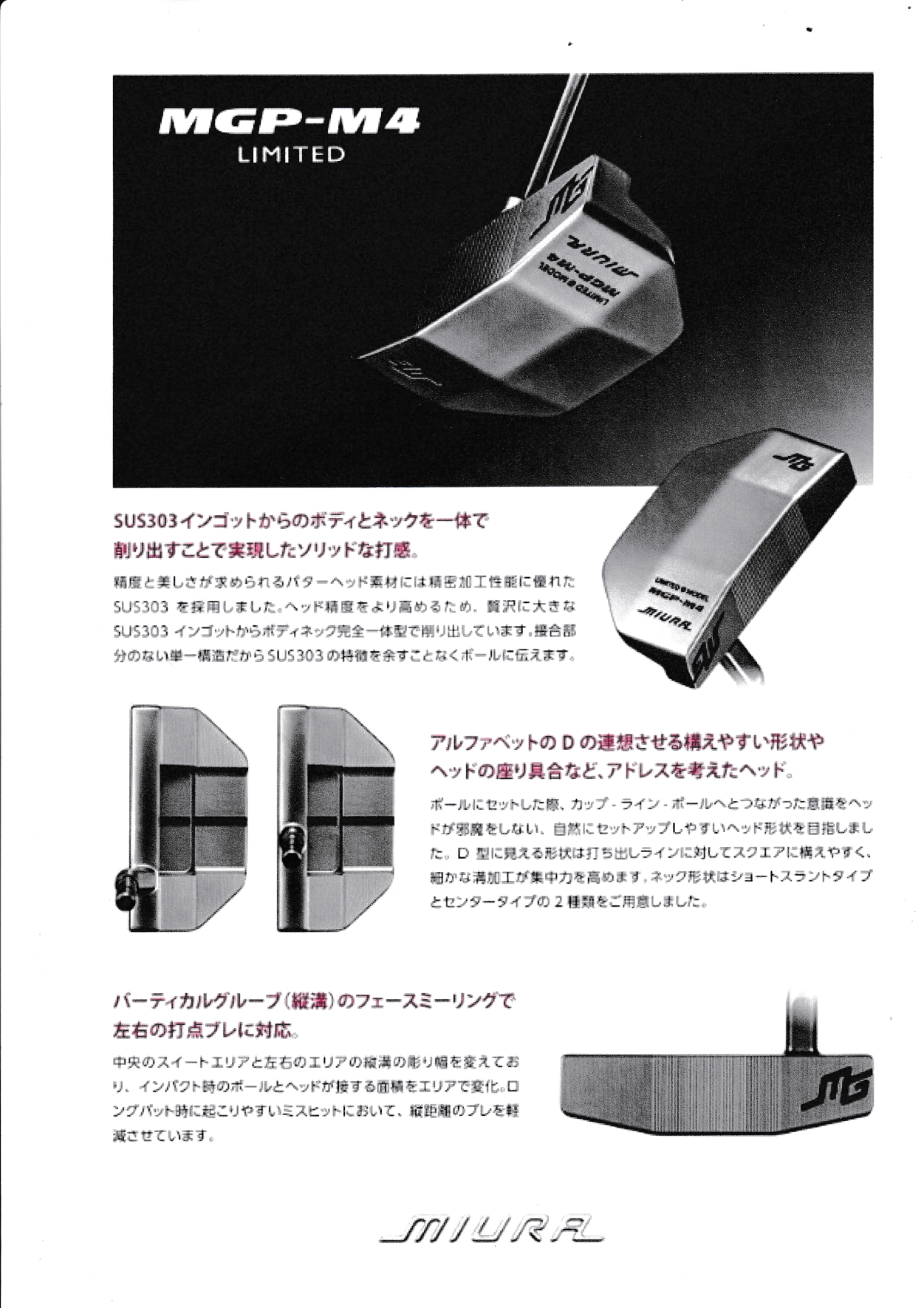 三浦技研㈱ MGP-M2パター(ヘッドカバー付き) ヘッド価格¥50.000+消費税 国内200個限定販売