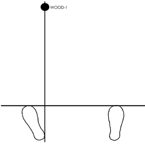 5番アイアンではドライバーに比べ右足が足幅分移動し歩幅がやや狭くなり、構えた感じでは、ボールの位置は体中央に感じます。 ボールの位置をこれより右に持っていけば、ボールはプッシュアウト気味に右にいきます。 |